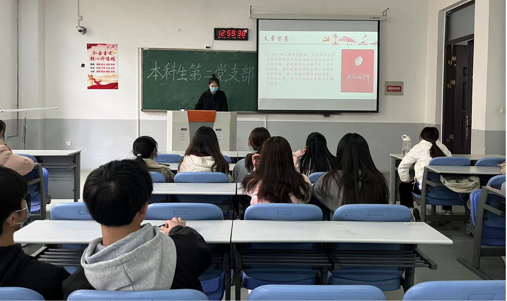 接着由闵聪聪同志介绍了第二部分内容“割据地区的现势”,从军事问题、土地问题、政权问题、党的组织问题、革命性质问题、割据地区问题等六个方面进行了详细讲解,带领同学们认真学习了毛泽东同志对割据地区现势的分析。