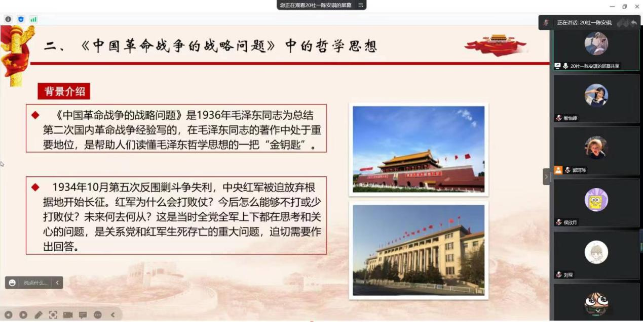 学生党员陈安琪和大家一起学习了毛泽东哲学思想,从《实践论》、《矛盾论》、《论持久战》等多篇文章中总结出要掌握马克思主义唯物辩证法,要学会从实际看问题,从全局看问题,懂得从感性认识上升到理性认识,要学会分析形式,认清形式和任务。学习的目的在于运用,要将相关哲学思想运用到现实生活中,智慧的处理生活中的问题。