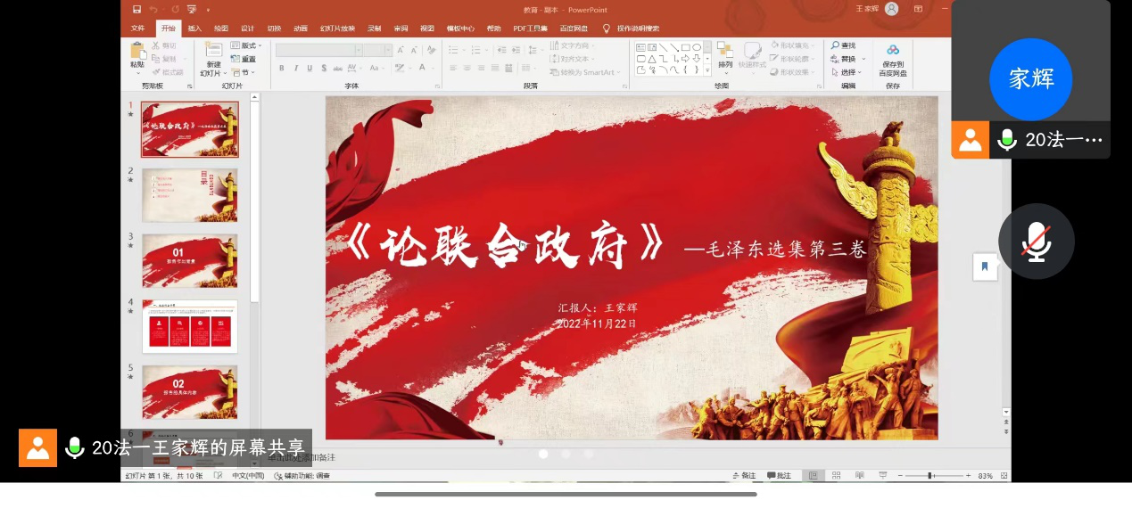 本科生第一党支部学生党员王家辉以《毛泽东选集》第三卷《论联合政府》为题进行分享,介绍了中共七大的背景以及《论联合政府》的提出背景,简要介绍了《论联合政府》的整体框架,重点分析了《论联合政府》中所蕴含的方法论与世界观。