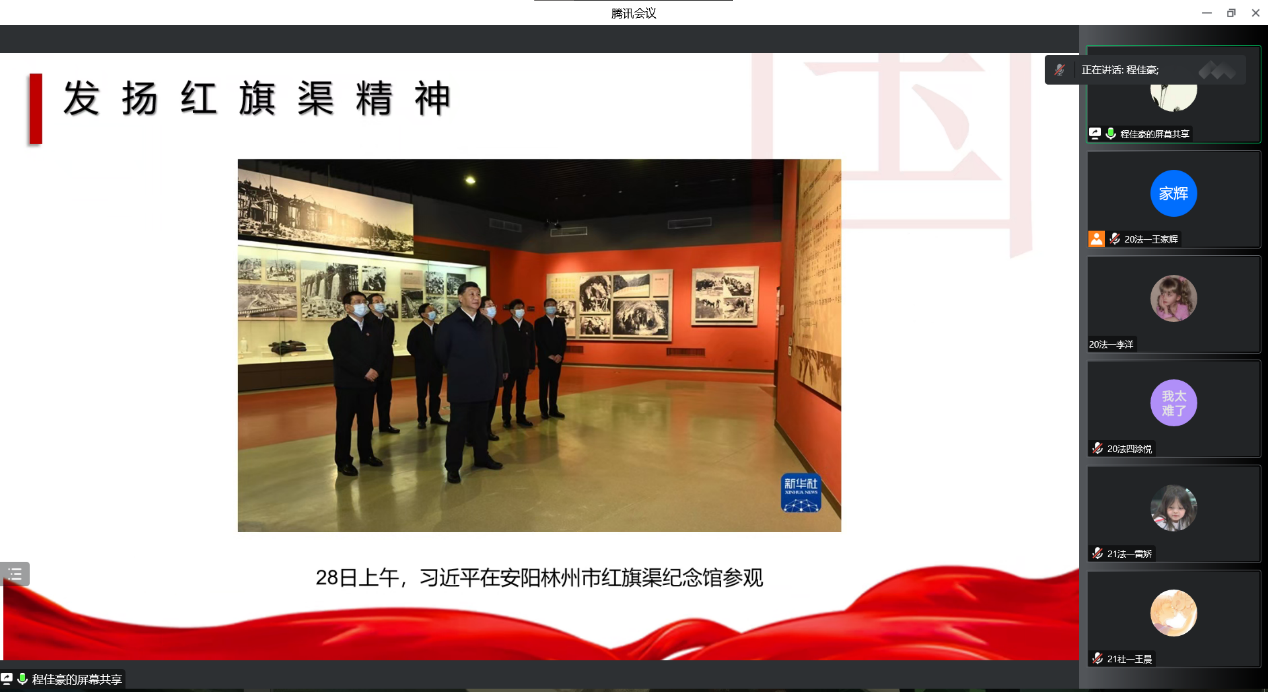 本科生第五党支部学生党员程佳豪结合时事,以习近平总书记考察安阳时的讲话和弘扬红旗渠精神为主题,重点讲述习近平总书记的讲话,采用图片分享等形式,深入检出的分析其中所蕴含的意义与启示。提出在当今时代红旗渠精神所蕴含的深远意义以及如何更好的坚持红旗渠精神。