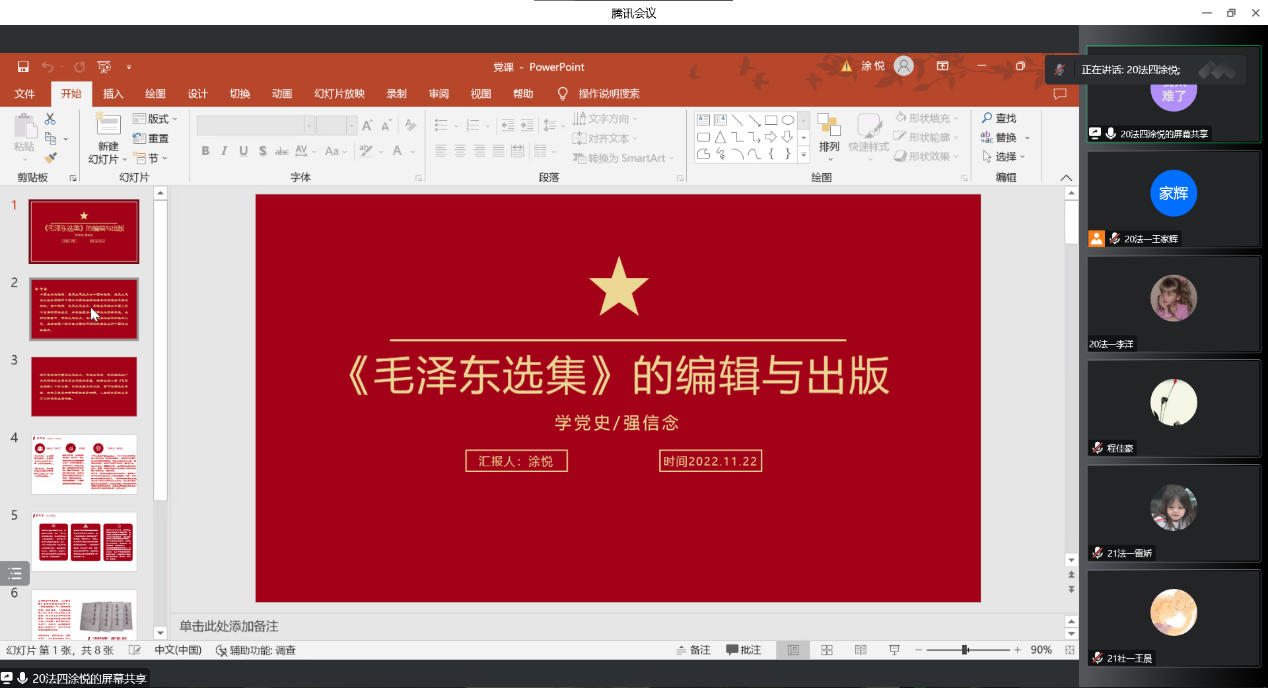 本科生一二五党支部于2022年11月22日中午通过腾讯会议线上会议开展了以学生党员代表微党课分享为主要形式的党课。