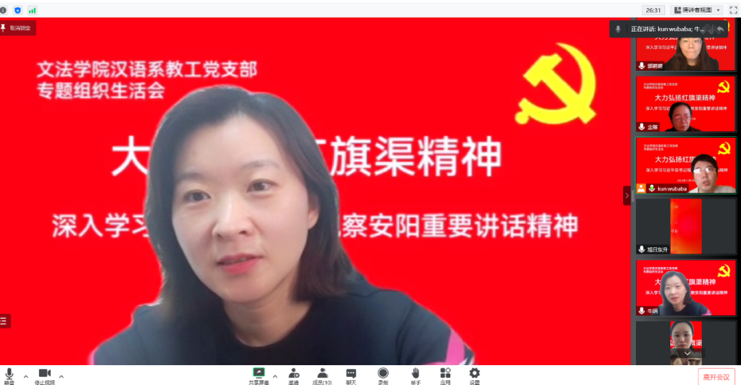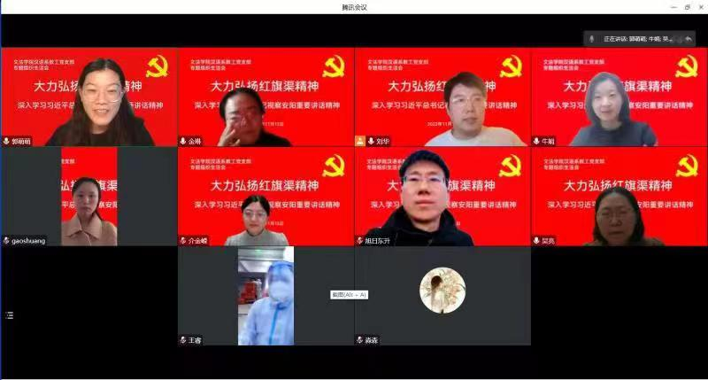 汉语系教工党支部通过网络平台腾讯会议召开“深入学习习近平总书记视察安阳重要讲话精神,大力弘扬红旗渠精神”专题组织生活会。会议由汉语言文学系教工党支部书记刘华主持,学院党委书记牛娟以普通党员身份参加此次会议。