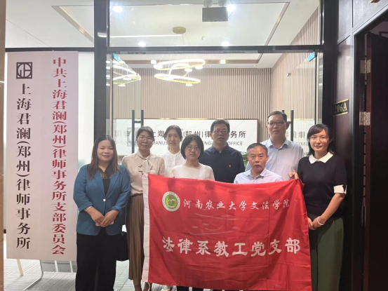 法律系到上海君澜(郑州)律师事务所开展访企拓岗促就业活动,举行学习贯彻“习近平法治思想”主题党日活动。学院副院长杨红朝,法律系教工党支部书记、系主任韩宁,学院教学秘书徐轶博,法律系副主任赵菊敏,学院办公室副主任杨柳青,法律系教师代表刘广林、王可利、贾秋宇等,上海君澜(郑州)律师事务所党支部书记杨新勤,律所执行主任彭逸豪,执业律师赵国栋、曹秋香等参与活动。