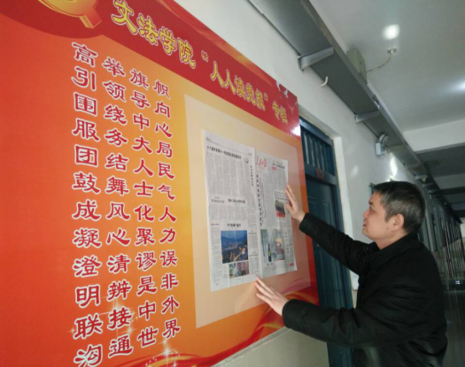 为响应河南省委的号召,进一步发挥党报党刊思想舆论主阵地作用,黄色网站 积极开展了“学讲话 读党报 为中原添彩”活动。2月24日上午9:00,黄色网站 党委书记李培玉为学院“人人读党报”专栏张贴第一期党报。