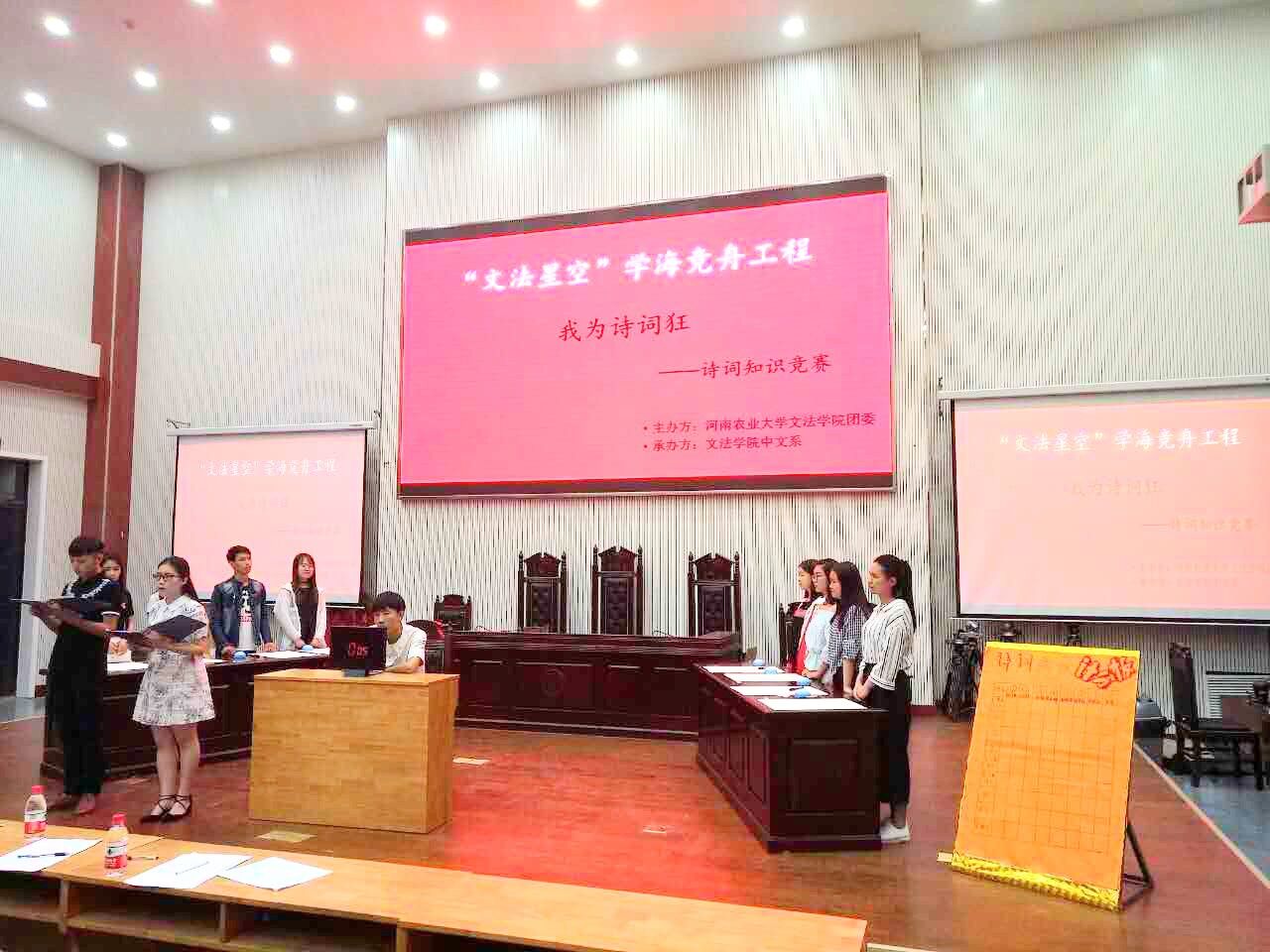 中文系于模拟法庭举办了“我为诗词狂”——诗词比赛活动。中文系金琳等四位专业教师和团委辅导员朱瑞萍老师以及14、15、16 级汉语国际教育全体学生参加了本次活动。