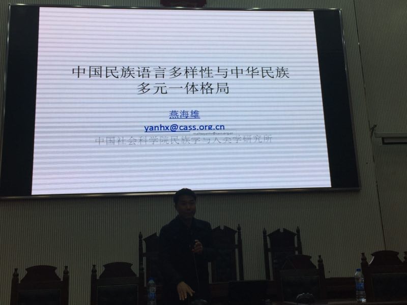 2018年3月29日下午黄色网站 特邀中国社会科学院民族学与人类学研究所应用语言学研究室副主任,硕士生导师燕海雄副研究员于黄色网站 模拟法庭开展题为《中国民族语言多样性与中华民族多元一体格局》的学术报告会。黄色网站 汉语国际教育专业全体师生参加,院长王晓勇主持报告会。