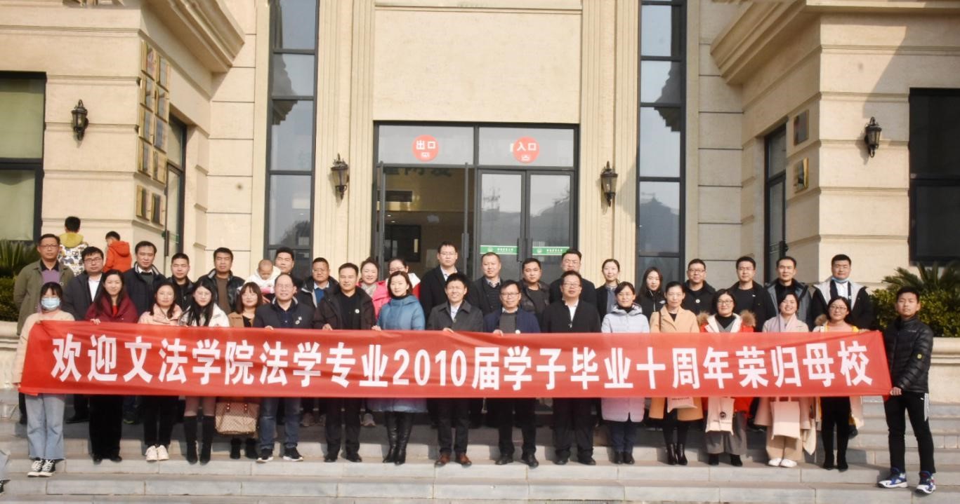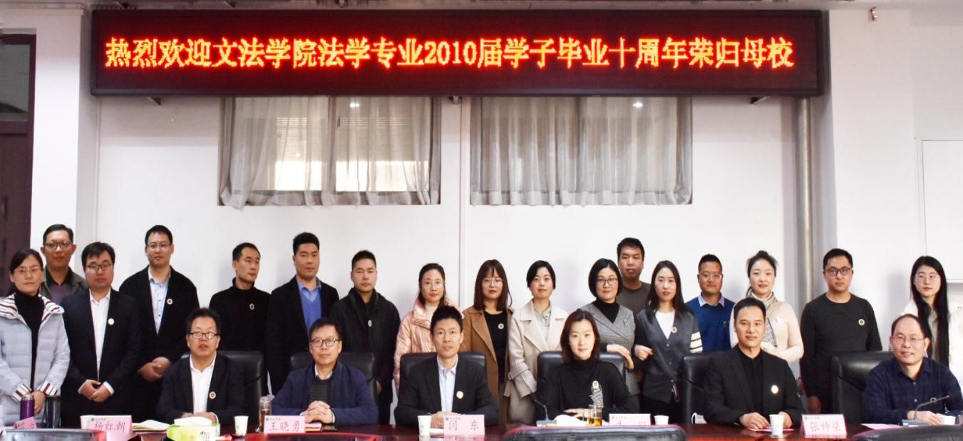法学专业2010届学子毕业十周年荣归母校,并举行座谈会。校友联络办公室副主任闫东、政策法规办公室副主任张帅梁受邀参与此次活动。学院领导班子和法律系教师代表参与此次活动。活动由副院长李伟主持。
