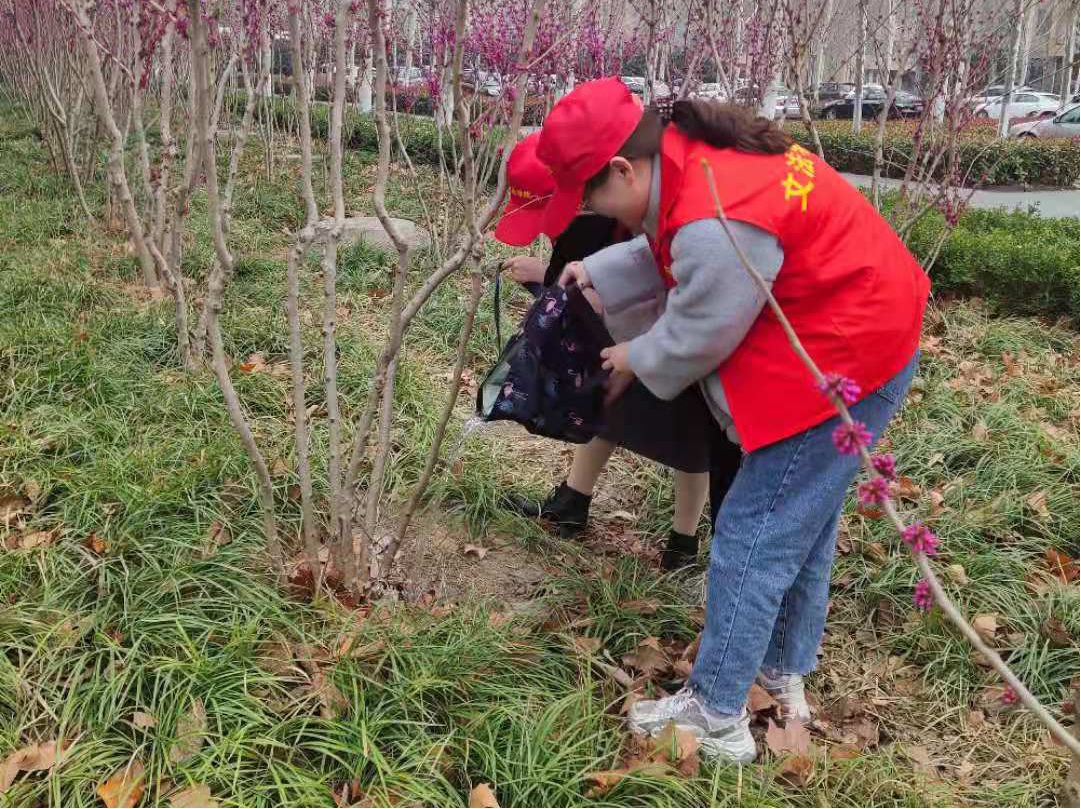 活动现场,学生统一着红色志愿服,用清扫工具在校园各处对植被周围的落叶及垃圾进行清扫,用各种浇水工具对植被进行浇灌,用铲子对树木根部进行加固培土,大家热情饱满、干劲十足,三三两两一组,彼此配合,十分默契。经过两个小时的共同努力,小树都变得更加有生机。参与劳动的学生们反映积极热烈,纷纷表示通过这次劳动感受到了集体的力量,切身体会到了劳动带来的乐趣,在日后的学习生活中,会更珍惜干净舒适的校园环境。