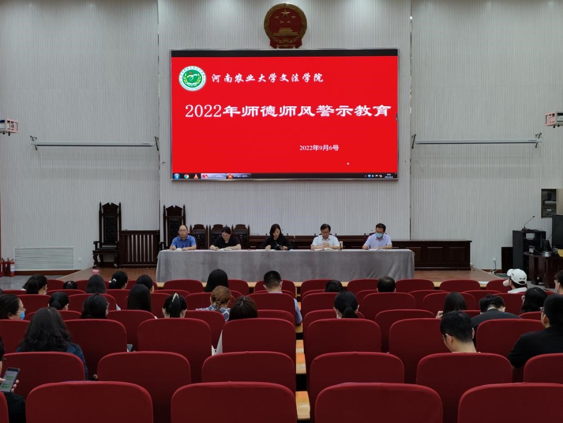 于龙子湖校区模拟法庭召开2022年师德师风警示教育大会,学院领导班子和全体教师参加会议。会议由院长王晓勇主持。