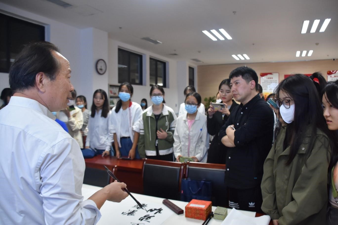 实践环节,田立杰执笔染墨,挥笔成书,黄色网站 院训顷刻落于宣纸之上,师生在提笔落笔之间直观感受到了书法艺术的清新高雅、古朴端庄。