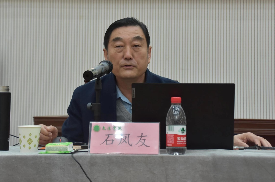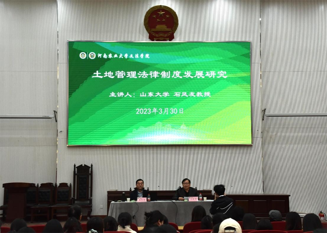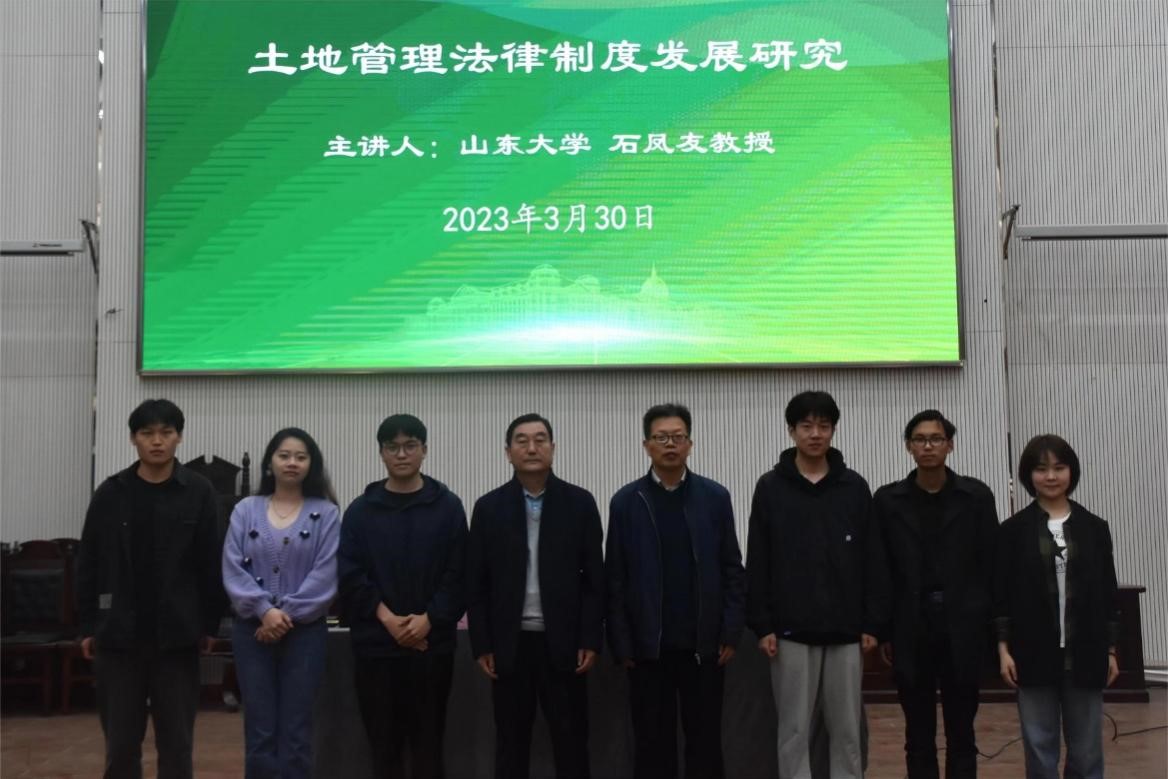 特邀山东大学法学院石凤友教授为师生作“土地管理法律制度发展研究”主题报告会。院长王晓勇,副院长杨红朝以及法律系师生代表参加会议。会议由王晓勇主持。会议伊始,王晓勇对石凤友的到来表示感谢和欢迎,并介绍了石凤友学术成就。