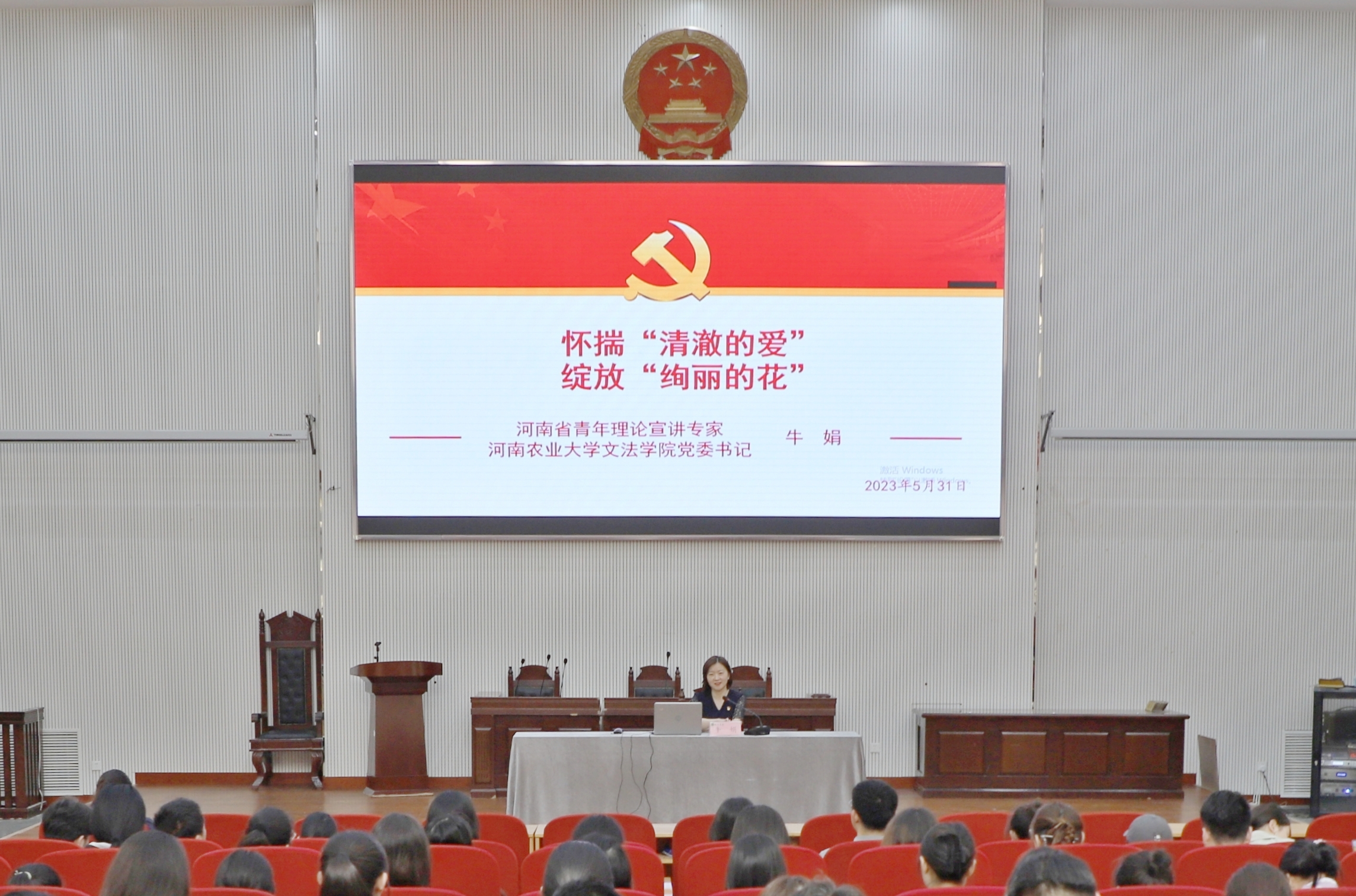党委书记牛娟在模拟法庭以“怀揣‘清澈的爱’,绽放‘绚丽的花’”为题为2023届毕业生讲“最后一节党课”。院党委副书记余果、院团委书记王鹏举、团委副书记赵梦闪及2023届全体毕业生参加此次活动。