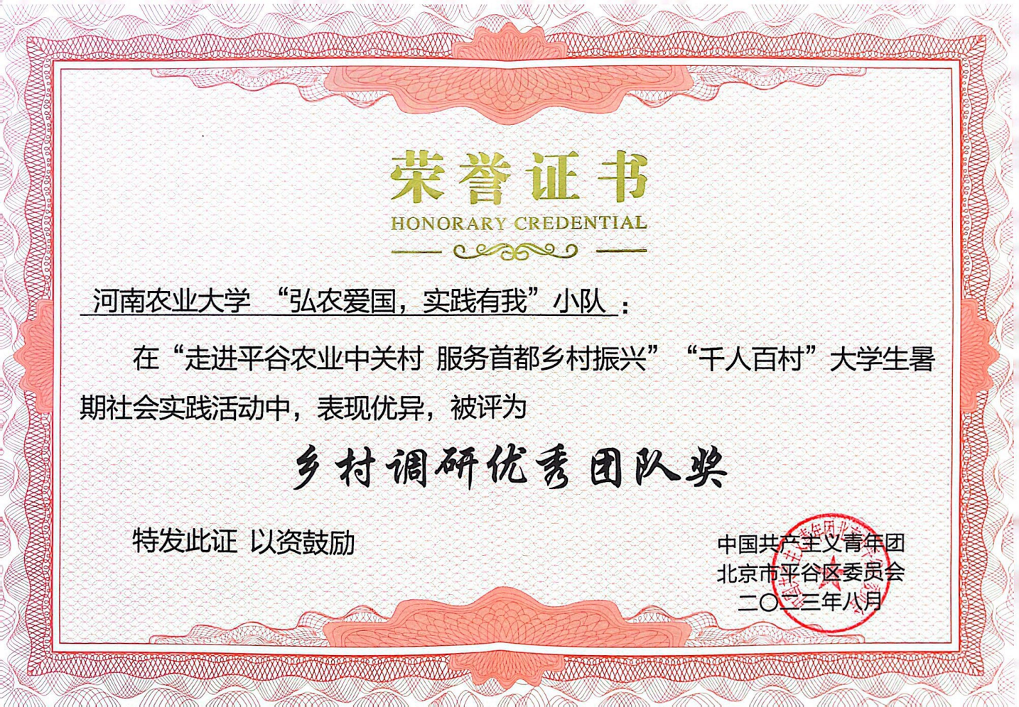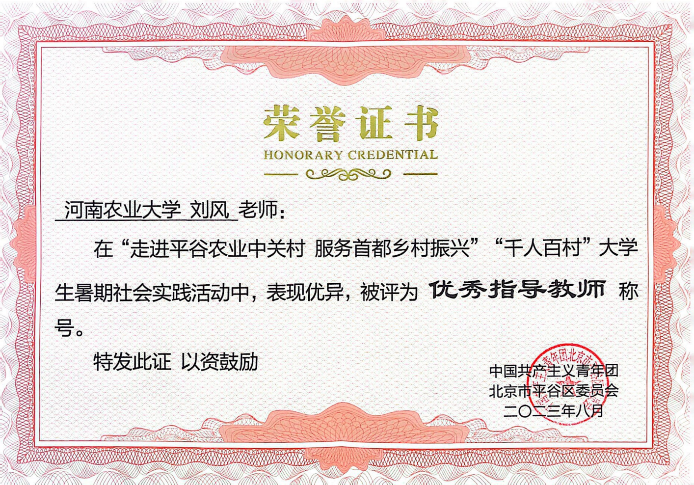 社会学系主任刘风被评为“优秀指导教师”, 2022级社会工作专业蔡超凡、魏青青、马琳欣和胡悦琦同学组成的“弘农爱国,实践有我”小队被评为“乡村调研优秀团队奖”。