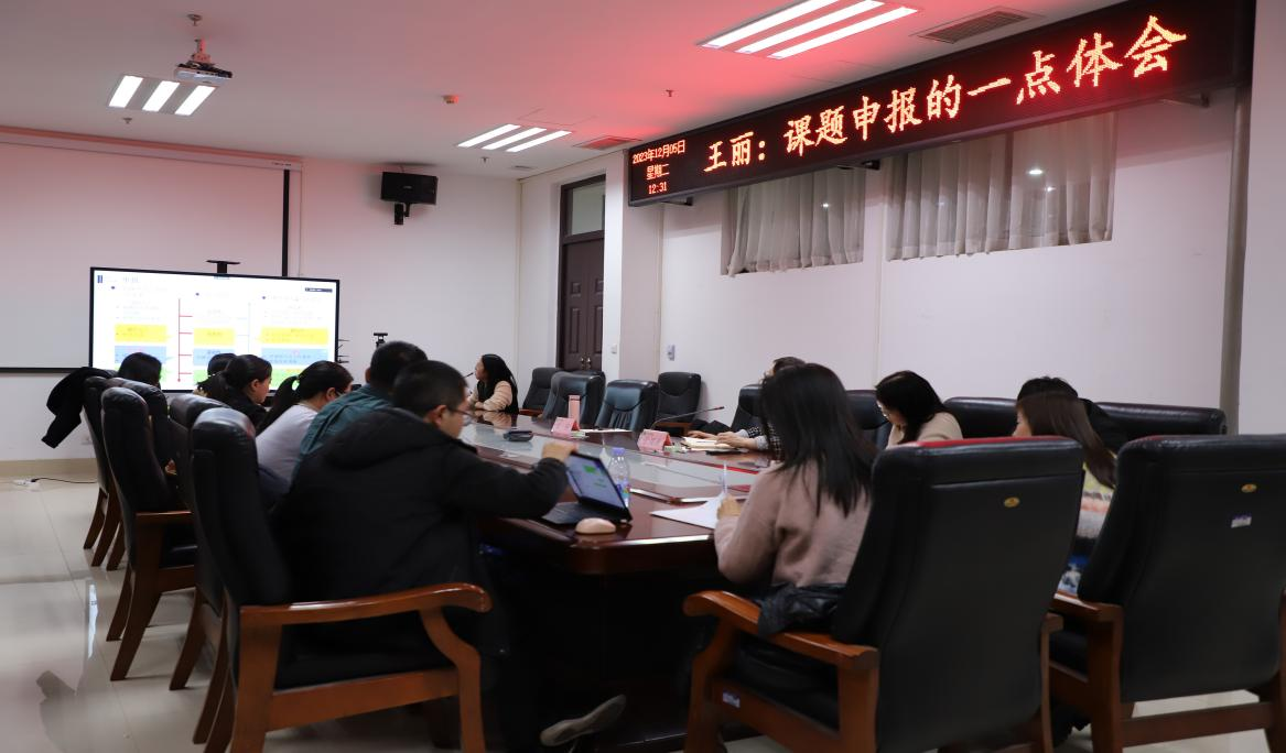 王丽以《课题申报的一点体会》为主题进行分享。她结合个人申报项目的经历展开交流,她指出:抓住选题思路和明确选题来源是选题的两大关键点,选题要体现国家、地方需求,研究基础即前期成果的展示,预期成果可量力而行,细节问题还要反复修改完善。