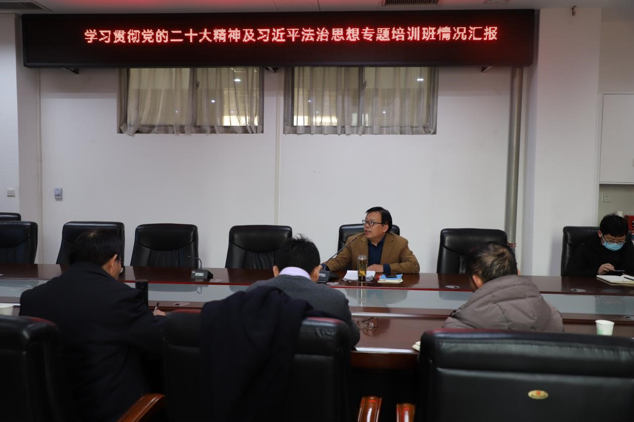 在龙子湖校区教学楼A310召开学习贯彻党的二十大精神及习近平法治思想专题培训班情况汇报会。法律系教师和全体法律硕士生参加会议,会议由院长王晓勇主持并汇报。