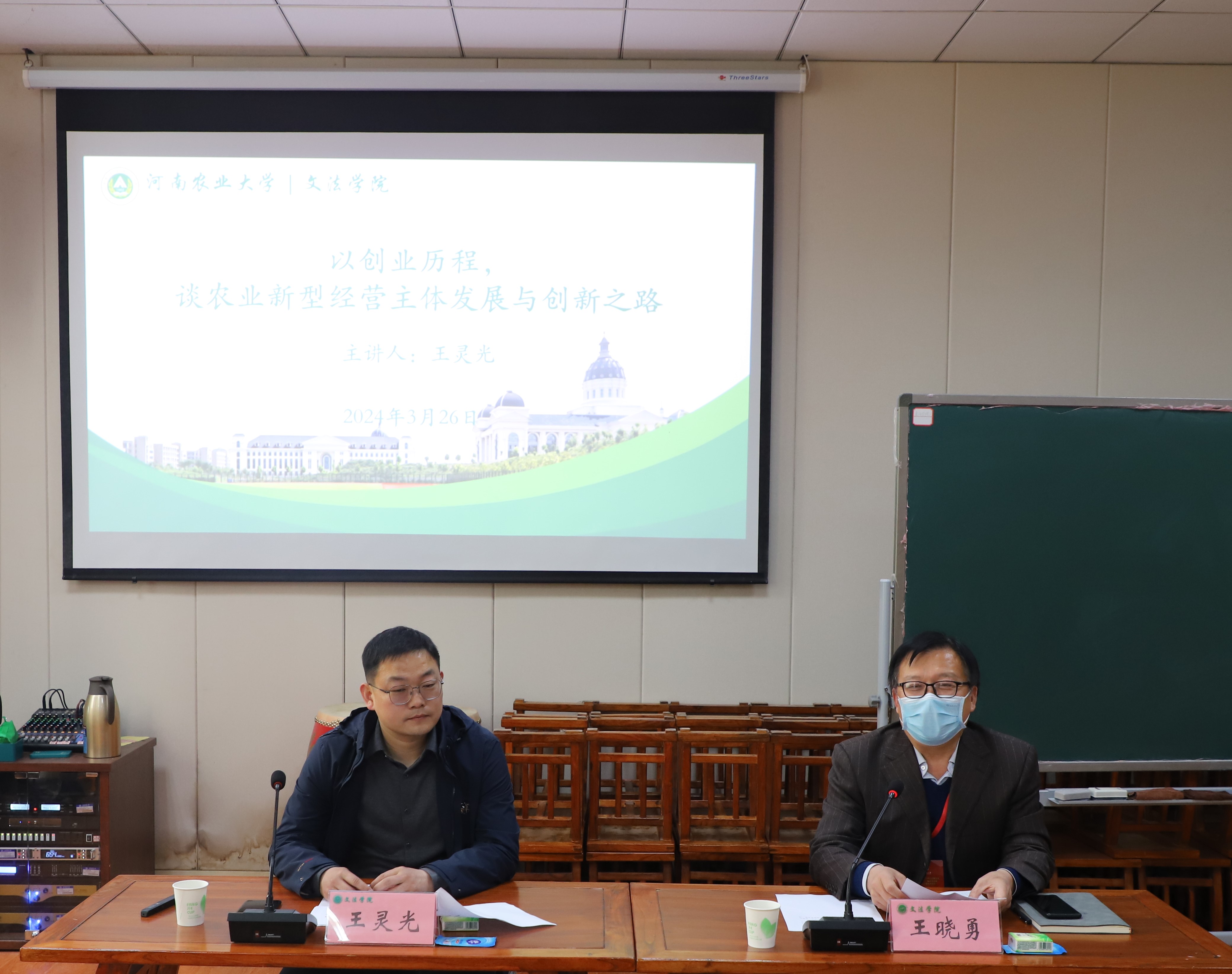邀请我校优秀校友、共青团第十七届全国代表大会代表、河南省促进农村就业创业先进个人、河南赋农科技有限公司董事长王灵光举办新型农业经营主体发展与创新专题报告会。院长王晓勇、行政管理系主任管煜武以及部分教师和农业管理专业研究生参会,会议由王晓勇主持。