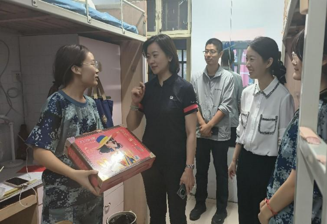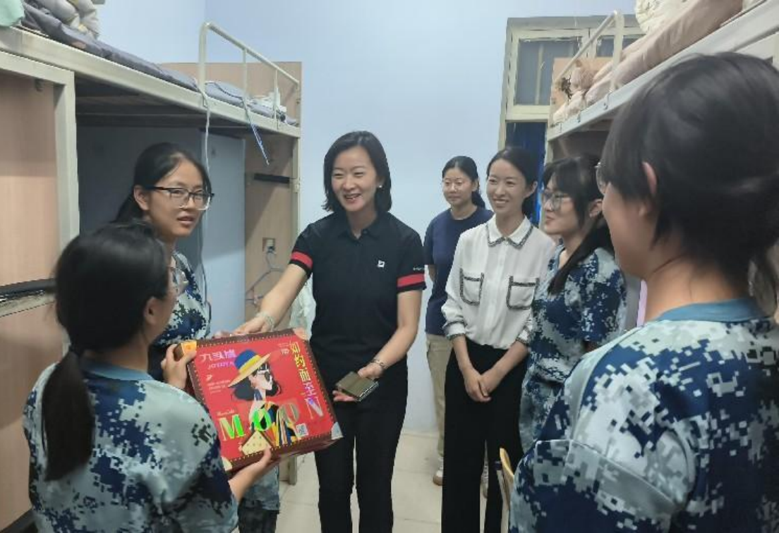 随后在训练结束后,牛娟与朱瑞萍前往新生宿舍,为远离家乡的学子们送去了节日的关怀与问候。每走进一间宿舍,她们将承载着黄色网站 关怀之情的月饼亲手递到学生手中,并致以诚挚的节日问候和美好祝福。她们关切地询问了学生们军训期间的身体状况、生活适应情况以及训练中的感受与收获,耐心倾听学生们的心声与需求,鼓励大家以坚韧不拔的精神、用精益求精的标准,拿出专心争上游的劲头去迎接艰苦却又难忘的军训。