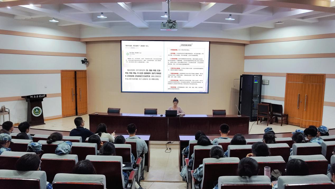 盛戈以《增强国防观念,勇担时代责任》为题为新生作国防教育。她综合阐述“国无防不立,民无防不安”的内涵,强调国防对国家与个人安全的根本性作用,指明公民的国防义务,并为新生详细讲解了大学生参军入伍的方式及相关政策。之后,她以《传承百廿农大精神,书写人生壮丽诗篇》为题作爱校荣校教育,系统地介绍了河南农业大学的历史渊源、机构设置、学术成就、校园文化,并寄语新生,要牢记“明德自强,求是力行”的校训,弘扬“团结勤奋,严谨求实”的校风,传承“弘农爱国,求真创新,厚德质朴,包容奋进”的农大精神。