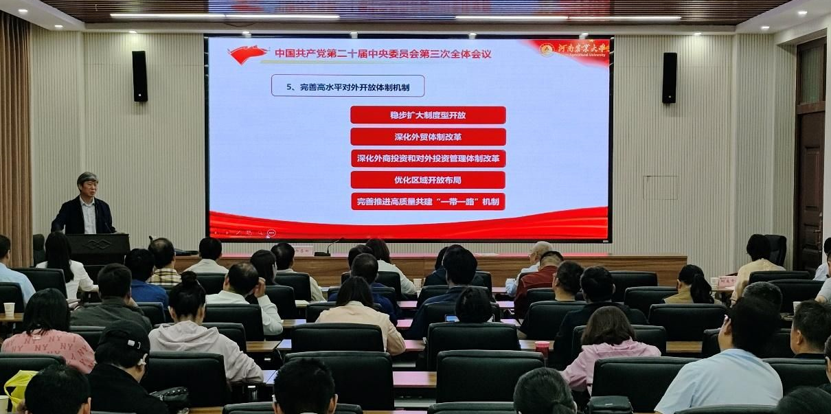 杨喜田围绕党的二十届三中全会审议通过的《决定》文本、习近平总书记在党的二十届三中全会上的讲话精神、河南农业大学改革发展实践探索的有关经验和启示三个方面,系统地解读阐释了党的二十届三中全会的精神实质、核心要义和实践要求,深入浅出地带领大家深入地理解了党的二十届三中全会的重大时代意义和深远历史影响,以及党的二十届三中全会为我校高质量发展带来的历史性发展契机。