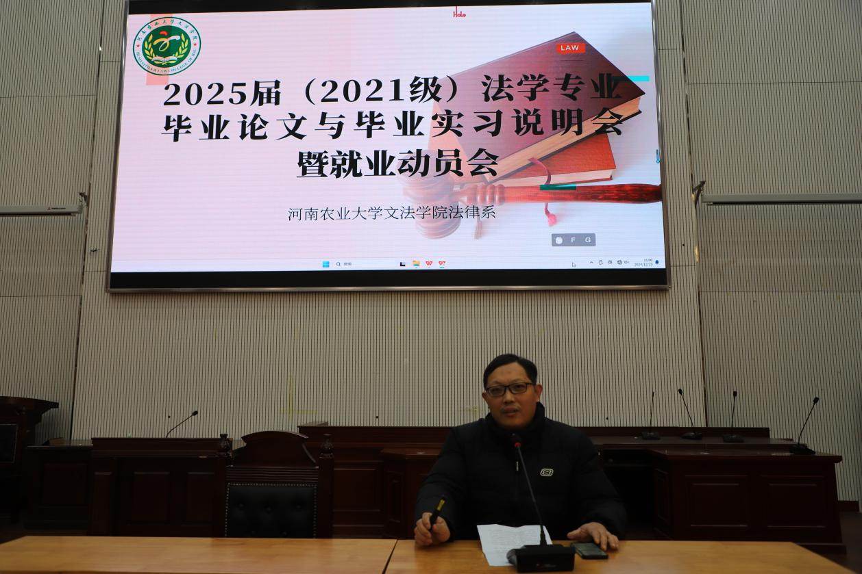本网讯(通讯员 法律系 图片 法律系)为进一步落实毕业论文、毕业实习等工作,法律系于12月23日在龙子湖模拟法庭召开“2021级法学专业毕业论文写作与毕业实习说明会暨就业动员会”,法律系主任韩宁对相关问题进行说明并做就业动员,2025届法学专业毕业生参加。