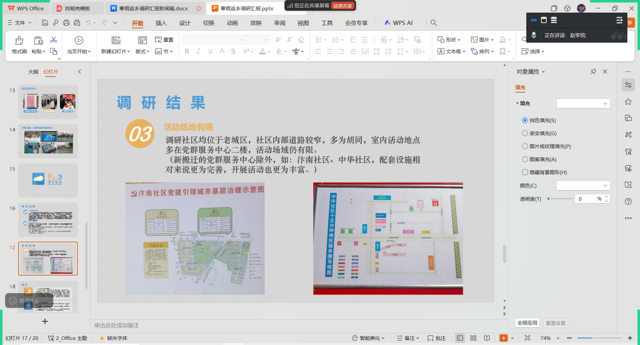 交流会现场气氛活跃,同学们积极分享调研中的趣事与感悟,同时也坦诚交流了在调研过程中遇到的困难与挑战。刘风、赵路淋两位老师对同学们的调研成果给予了充分肯定,称赞大家在短时间内深入基层,获取了有价值的数据和信息,展现了社会工作学生的实践能力和责任担当。同时,她也指出,同学们在调研分析中还可以进一步挖掘数据背后的深层次原因,将理论与实践更紧密结合,对城乡社区建设、社区治理有自己的思考。