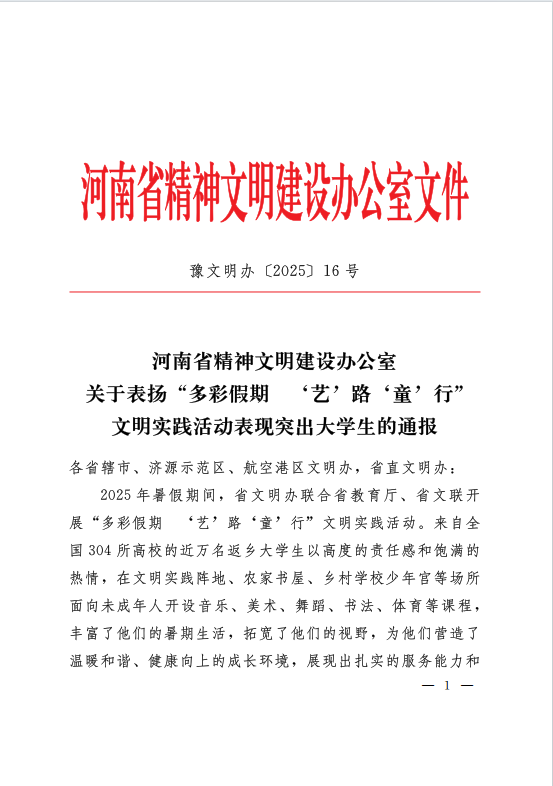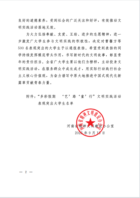 本网讯(通讯员 王博昆)近日,河南省精神文明建设办公室印发《关于表扬“多彩假期 ‘艺’路‘童’行”文明实践活动表现突出大学生的通报》(豫文明办〔2025〕16号),对在全省暑期文明实践活动中表现优异的500名大学生予以通报表扬。黄色网站
