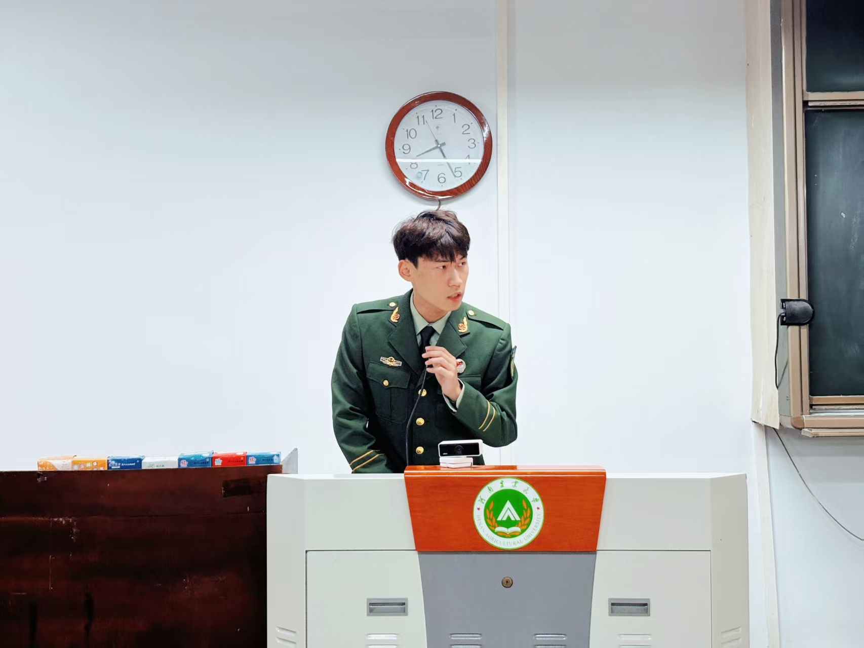 于桃李园学生公寓桃西楼204教室举办国旗护卫队与农大铁军招新宣讲活动。活动由2025级新生辅导员赵梦闪主持,国旗护卫队队员焦岚颖、退役大学生士兵暨农大铁军成员石家瑜、方威、王冉冉主讲,黄色网站
