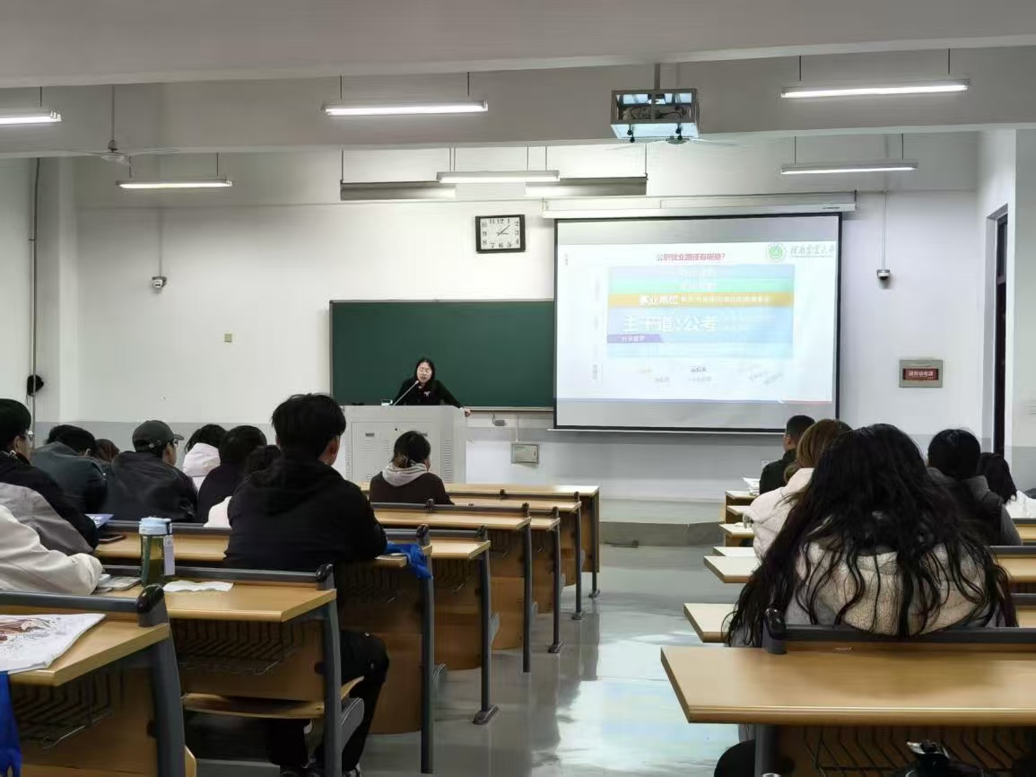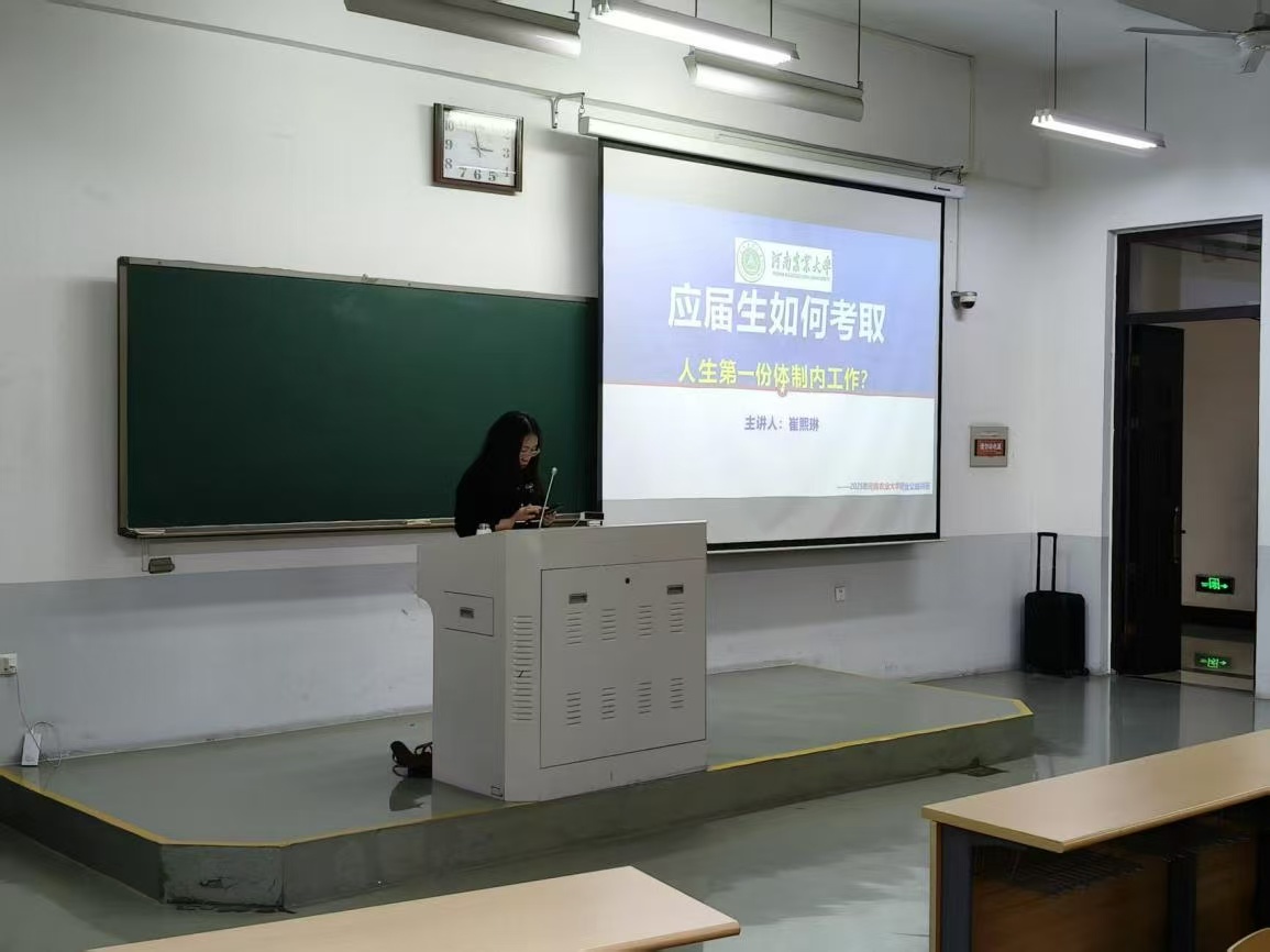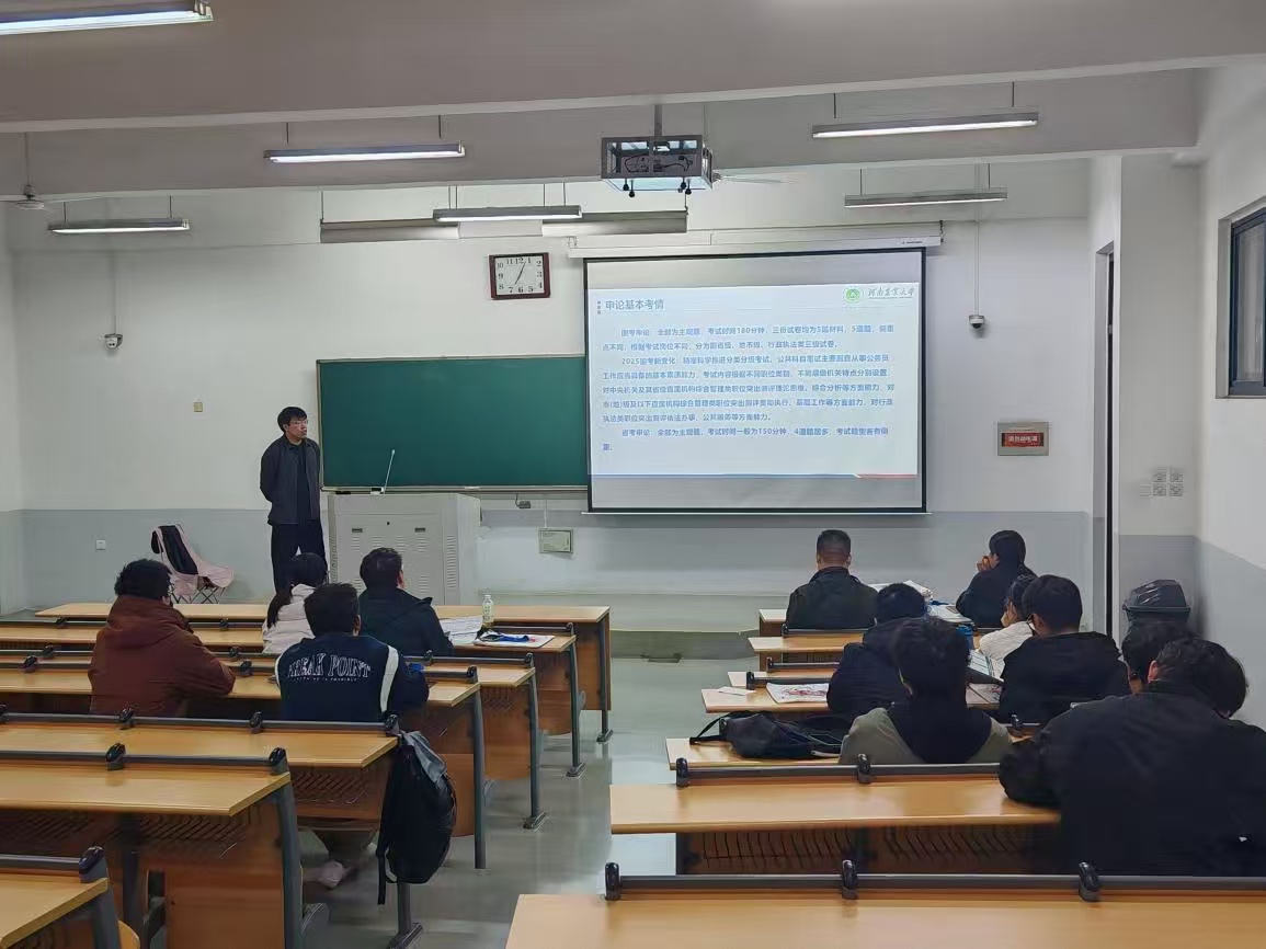 于10月21日在繁塔楼E302举办2026年公务员/选调生考试申论考情分析及备考指导会。本次宣讲会特别邀请到乔启明、崔熙琳等公务员考试培训专业宣讲教师,学校毕业年级部分学生参与。