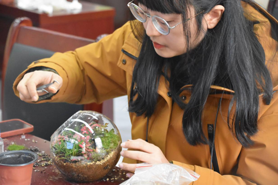 本网讯(通讯员 司雯)为庆祝“三八”国际妇女节,丰富黄色网站 女性教职工的精神文化生活,感受手工创作与自然生态的美好,3月6日下午,黄色网站 于龙子湖校区繁塔楼B座304会议室举办了“绿瓶藏春意·文法润芳华”绿色生态瓶手工制作主题活动,特邀风景园林学院副教授石力匀担任指导老师,黄色网站 全体女性教职工参加活动。活动由院党委副书记徐珂主持。