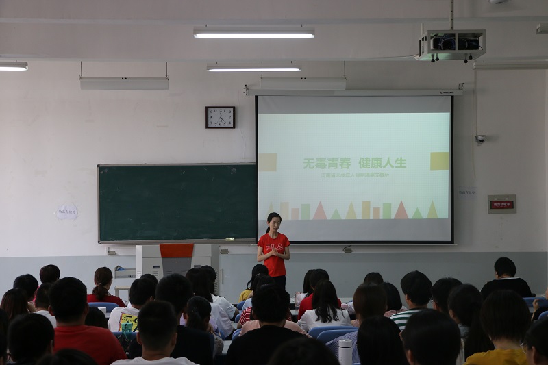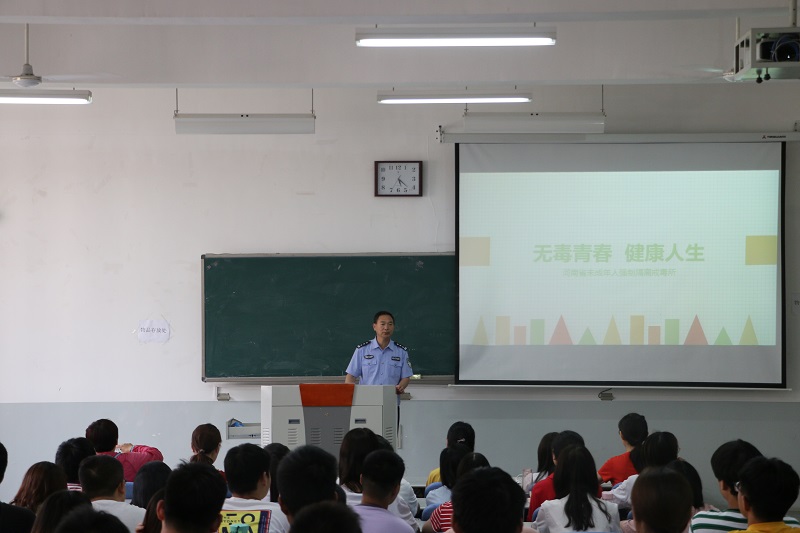 于2019年5月28日下午3点在教学楼c202开展“无毒青春 健康人生”专题禁毒讲座。河南省未成年人强制隔离戒毒所大队长陈启受邀出席讲座,党委组织员朱瑞萍和17、18级学生代表参加本次讲座。