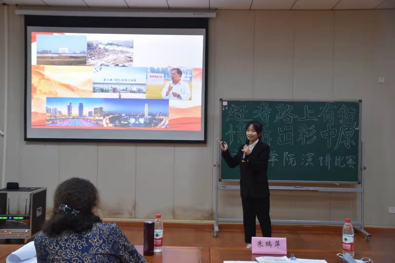 于艺术中心B201举办“赶考路上有我,情诉出彩中原”主题演讲比赛决赛。本 次比赛由初赛晋级的十名学生进行最后的角逐,汉语言文学系教师金琳、院党政办主任张二龙、团委书记朱瑞萍、团委副书记王鹏举、辅导员赵梦闪参与评审。