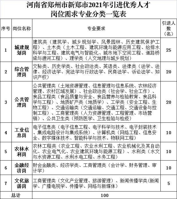 本次计划引进人才100名,岗位为市直机关和乡(镇、街道、管委会)所属的事业单位岗位。具体岗位计划需求专业类别详见《河南省郑州市新郑市2021年引进优秀人才岗位需求专业分类一览表》(附件1)。